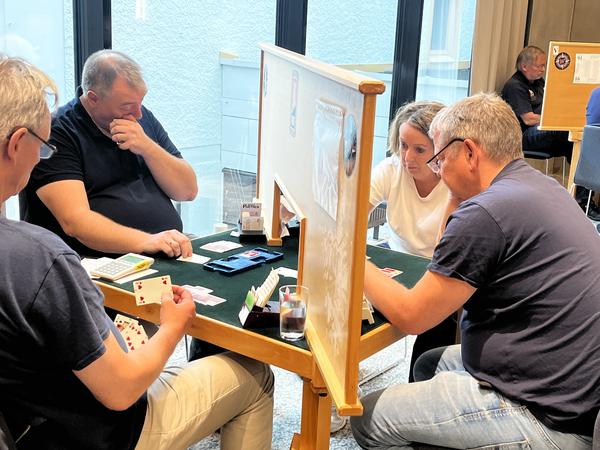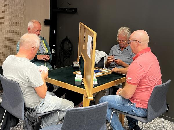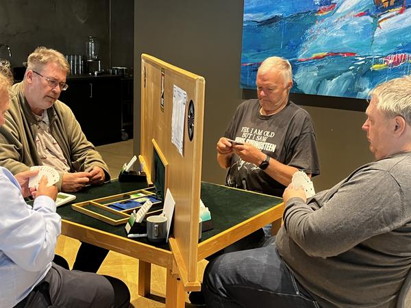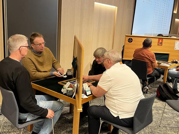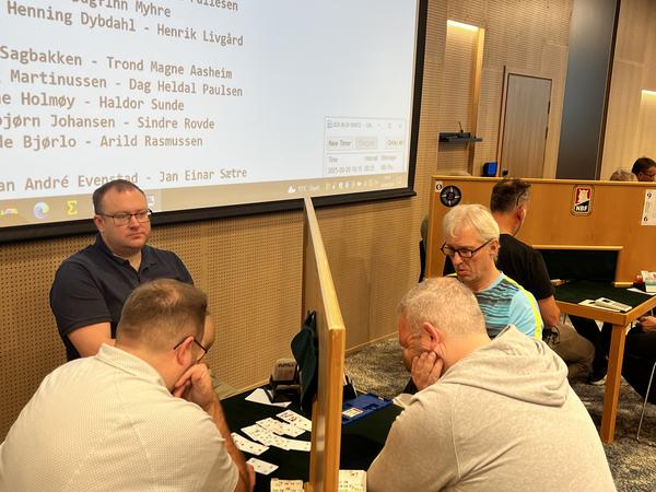 Etter de første 54 spillene (dag 1) ledet Sam Inge Høyland og Jo-Arne Ovesen, foran Christian Bakke og Geir Helgemo.